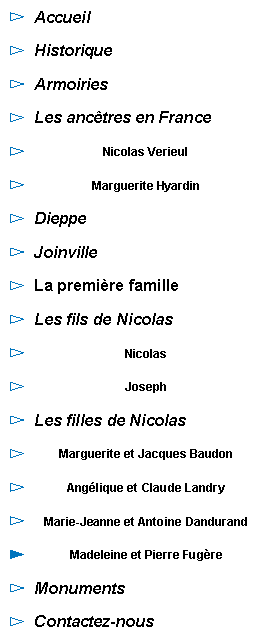 1.� Marie-Madeleine Fug�re/Foug�re� ������������ ������������ ������������ b 19 octobre 1704 St-Fran�ois, I.O. ������������ ������������ ������������ p/m Joseph Verieul et Claire Butaud � � ������������ ������������ ������������ ds 15-16 septembre 1723 St-Fran�ois,I.O. 2.Marie-Doroth�e Foug�re� ������������ ������������ ������������ n 31 janvier, b 1er f�vrier 1707 Ste-Famille, I.O. ������������ ������������ ������������ s 23 novembre 1758 St-Joseph-de-Beauce ������������ ������������ 1er m Fran�ois Vachon/Lamin�e (�10 mai 1730 Beauport) (Vincent � Marguerite Giroux) ��� �������� ������������ ������������ 13 juin 1729 Beauport, Qc ������������ ������������ ������������ ct. de mariage� 12 juin 1729 � notaire Duprac ������������ ������������ 2e m Jean Rodrigue (Ren� � Elizabeth Dauphin) ��� �������� ������������ ������������ �m. 7 mai 1731 Beauport, Qc 3.� Jean-Ambroise Foug�re � ������������ ������������ ������������ p/m Jean L�tourneau et Marguerite Verieure� ������������ ������������ ������������ ds 29-30 d�cembre 1738 St-Fran�ois, I.O. 4.� Marie-Genevi�ve Foug�re �� ������������ ������������ ������������ nb 17-18 mai 1710 St-Fran�ois, I.O. ������������ ������������ ������������ p/m Charles Lafleur et Marie Landry ������������ ������������ ������������ ds 12-13 juin 1754 St-Fran�ois, I.O. ������������ ������������ m Dominique Dompierre/St-Martin (Ren� - Anne Duchesne) ������������ ������������ ������������ 18 juin 1742 St-Fran�ois, I.O. ������������ ������������ ������������ n� 15 mars 1718 - St-Fran�ois I.O. ������������ ������������ ������������ �(vf Marie Amory (Michel - Anne Guimond) m. 09.02.1739 ������������ ������������ ������������ �� �9-10.03.1742 -� 26 ans 5.� Pierre Fug�re � ���������� ������������ ������������ nb 14 f�vrier 1712 St-Fran�ois, I.O. ������������ ������������ ������������ p/m Jacques Chr�tien et Marie Verieur ������������ ������������ ������������ ds 28 f�vrier 1712 St-Fran�ois, I.O. 6. Jean-Baptiste Fug�re ������������ ������������ ������������ nb� 7-8 septembre 1713 Ste-Famille, I.O. 7. Jacques Fug�re� ������������ ������������ ������������ nb 3 juin 1716 St-Fran�ois, I.O. ������������ ������������ ������������ p/m Jacques Lamare et Marie Gagn� ������������ ������������ ������������ ds 13-14 octobre 1778, St-Joachim, Montmorency ������������ ������������ 1er m Marie Josephe Otis/Jasmin (Joseph -� ?? ) ������������ ������������ ������������ 29 janvier 1742 St-Joachim, Montmorency ������������ ��������������������������� (vve� 1ere noces Fran�ois Quirion (fils Julien -Marie Lavergne) (m. avant 1730) ������������ ������������ ��������������� (nb 6-10 avril 1697 Cap St-Ignace - �28-29 juil. 1735 St-Joachim ������������ ������������ ������������ �(vve 2e noces de Jean Bolduc- m 16.07.1736 St-Joachim - � entre f�v/oct 1741)� ��������������� �������� �����������������������(fils Louis Bolduc - Louise Caron et veuf� en 1eres noces Th�r�se Racine - ������������ ������������ ������������ �������� ( m. 3 f�v 1733 -SAB et �8-9 d�c 1733 - 25 ans) ������������������������ 2e m� Marguerite Gagn� (Fran�ois - Fran�oise Poulin) ������������ ������������ ������������ 19 novembre 1759 - St-Joachim ������������ ������������ ������������ ds 12-13 juin 1786 St-Joachim (73 ans!) �������