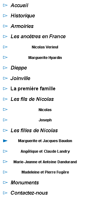Jacques BAUDON, fils de Jean (ma�on/tailleur de pierre)� et Jeanne Gey/Jay n vers 1662 � Ste-Madeleine-de-la-Jarrie, La Rochelle, France s�pulture :� 14 octobre 1712 - St-Fran�ois I.O. (petit-fils de Martin Baudon (ma�on et tailleur de pierre) et Jeanne Mesnayer)