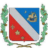 D�azur et de gueules � une bande d�argent, accost�e en chef d�un vaisseau d�or, voiles d�ploy�es voguant vers l�ouest et surmont� d�un croissant de lune du m�me, et en pointe d�une fleur de lys d�or, d�une feuille d��rable et d�une �toile du m�me.