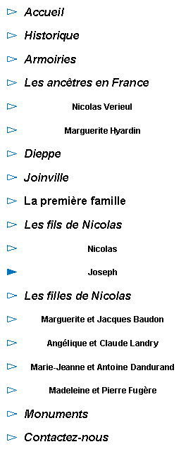 1.JOSEPH ������������ b 17 mai 1711 (Verieur) � St-Fran�ois, I.O. ������������ ������������ p/m Fran�ois Buteau � Marie Landris ������������ ds 5-6 mars 1731 (Virieux) � St-Fran�ois, I.O. � 20 ans